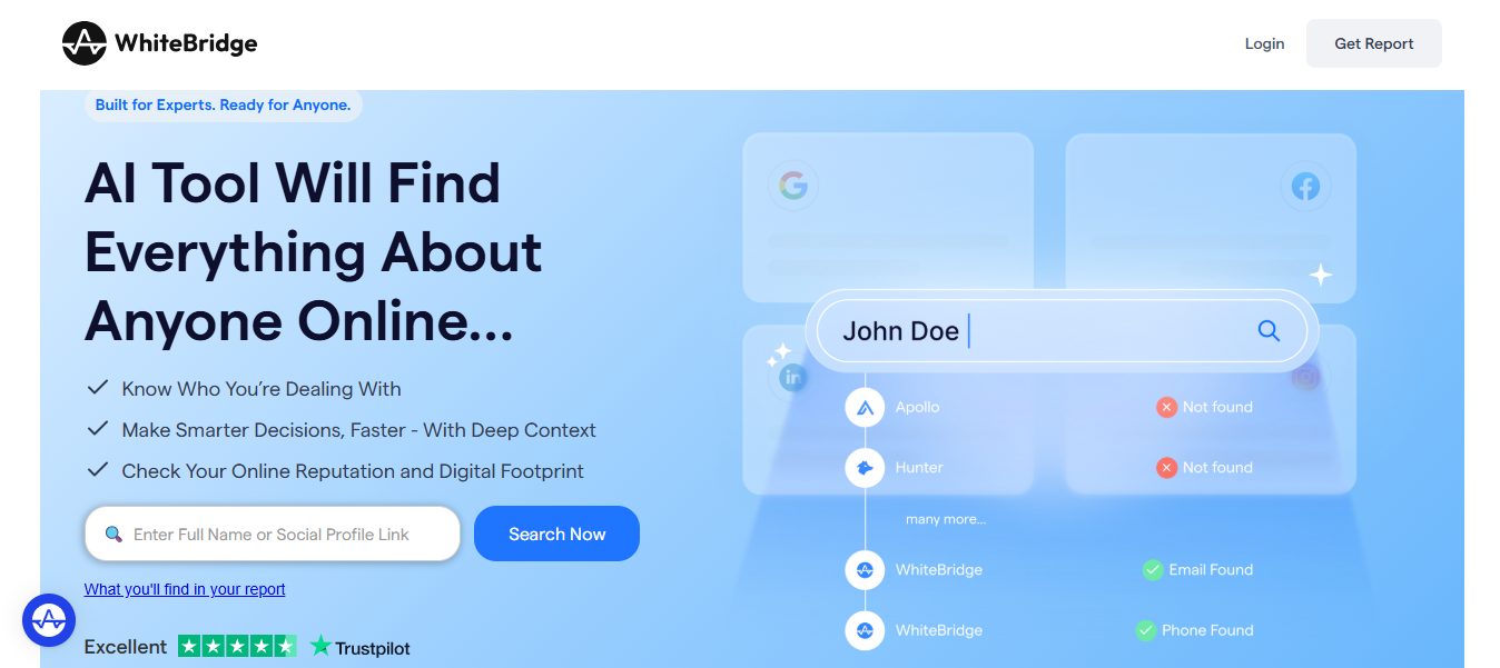 WhiteBridge AI is an advanced digital identity intelligence tool that goes beyond people search — it analyzes, verifies, and structures everything the internet says about someone into one insightful, easy-to-read report.