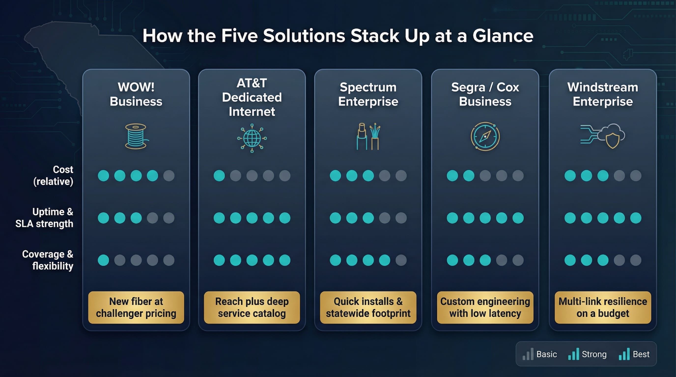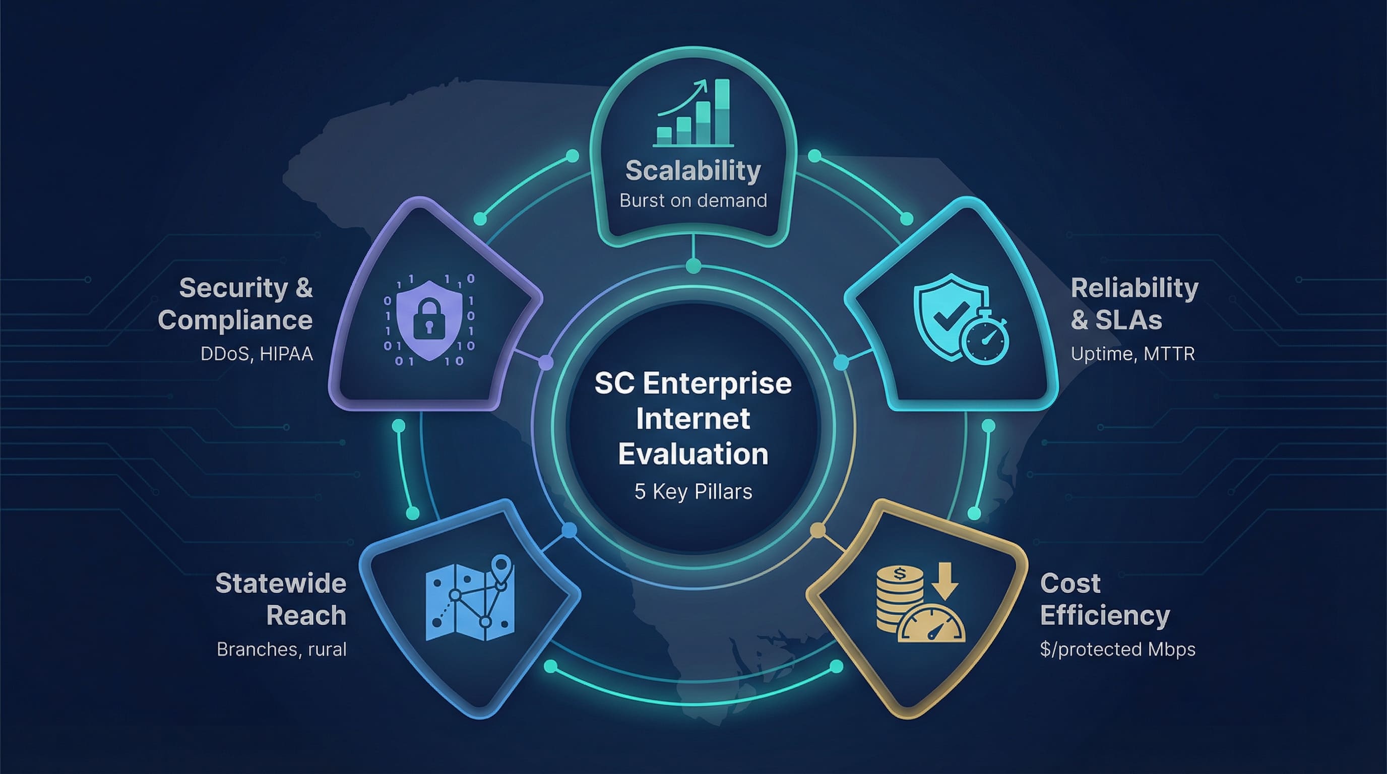 Coverage rounded out the core criteria. A solution isn’t enterprise-ready if your Charleston HQ hums while the Georgetown warehouse crawls on DSL. Statewide fiber footprints or SD-WAN bundles that blend cable and 5G links scored higher.