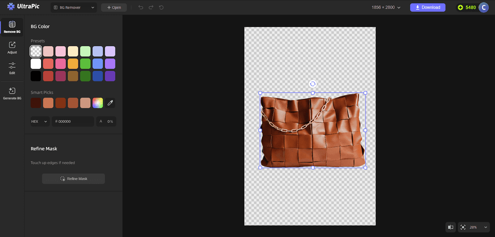 - After processing, zoom in to inspect details. Once satisfied with the result, click “Download,” select the PNG transparent format, and save the image with a transparent background for professional design use.