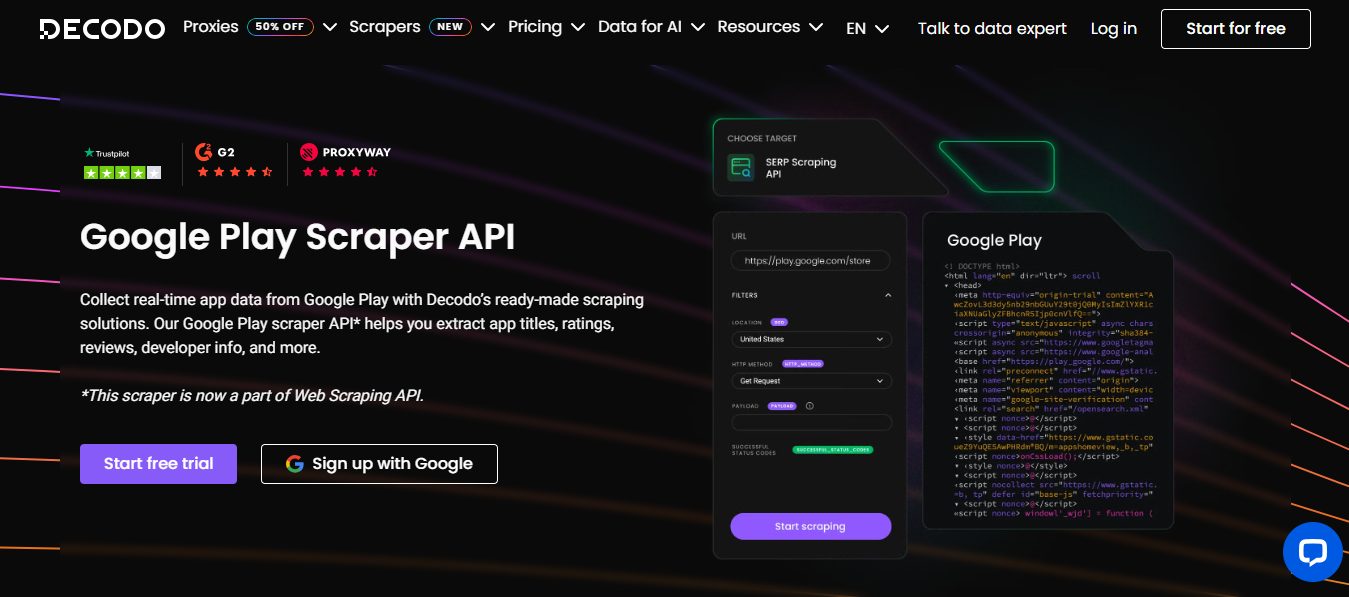 If you want dependable Google Play Store data without writing any code, a no-code scraping tool is the most efficient solution. Decodo’s Google Play Scraper API is a great example—it automates the entire scraping process for you.