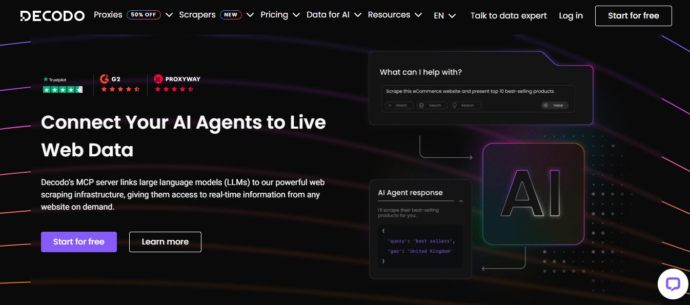 Decodo combines residential, datacenter, and rotating proxies with seamless MCP integration. Their dashboards support advanced rotation rules, AI-optimized traffic routing, and flexible bandwidth control.