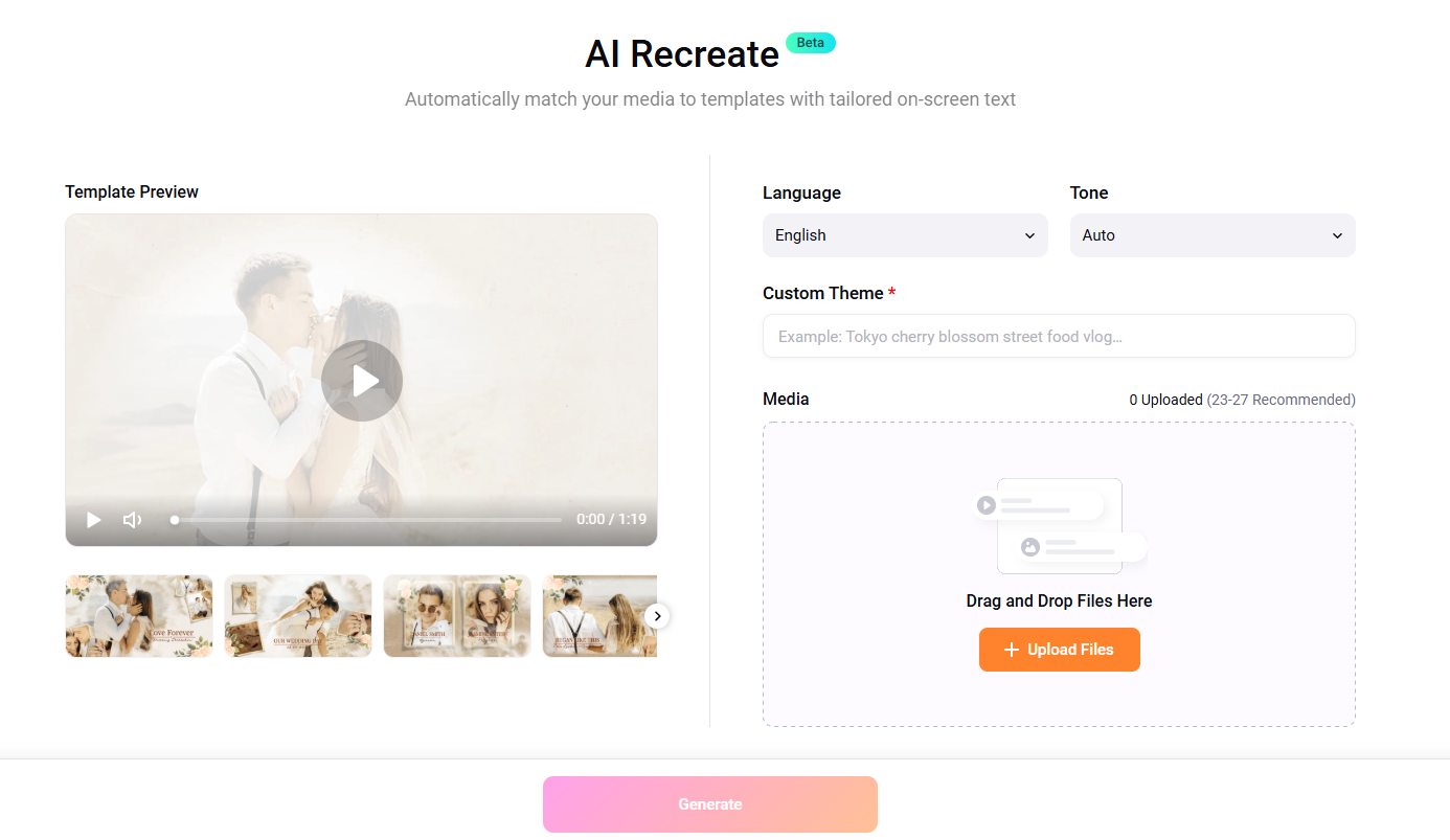 AI Recreate is designed for users who need to produce multiple versions of a video from the same set of clips. This is especially useful for creators who publish on several platforms and need different aspect ratios or pacing styles.