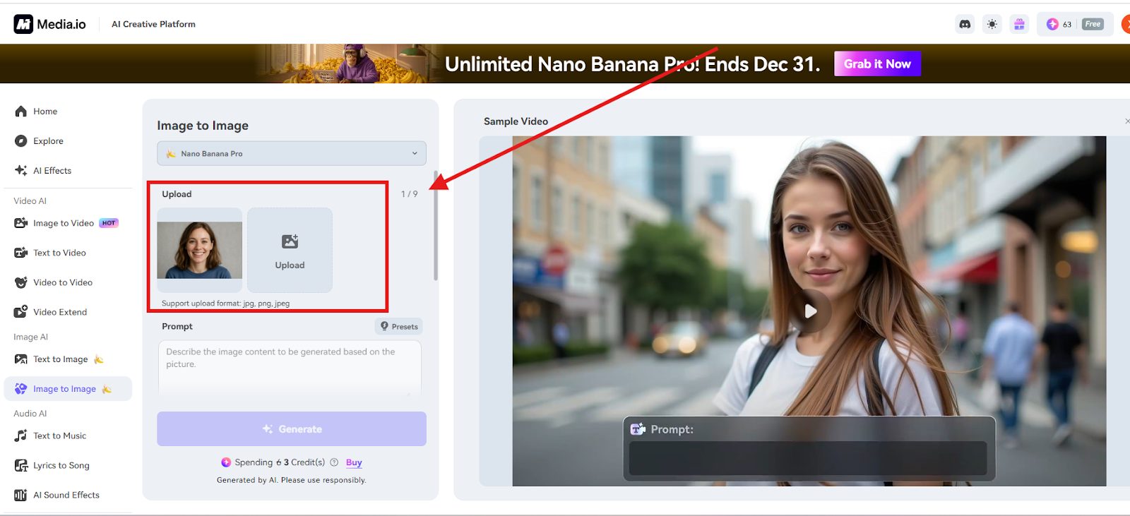 Using Media.io’s image-to-image AI is surprisingly simple. You can master the entire process in about a minute. Just follow the three easy steps below to start transforming your images instantly.