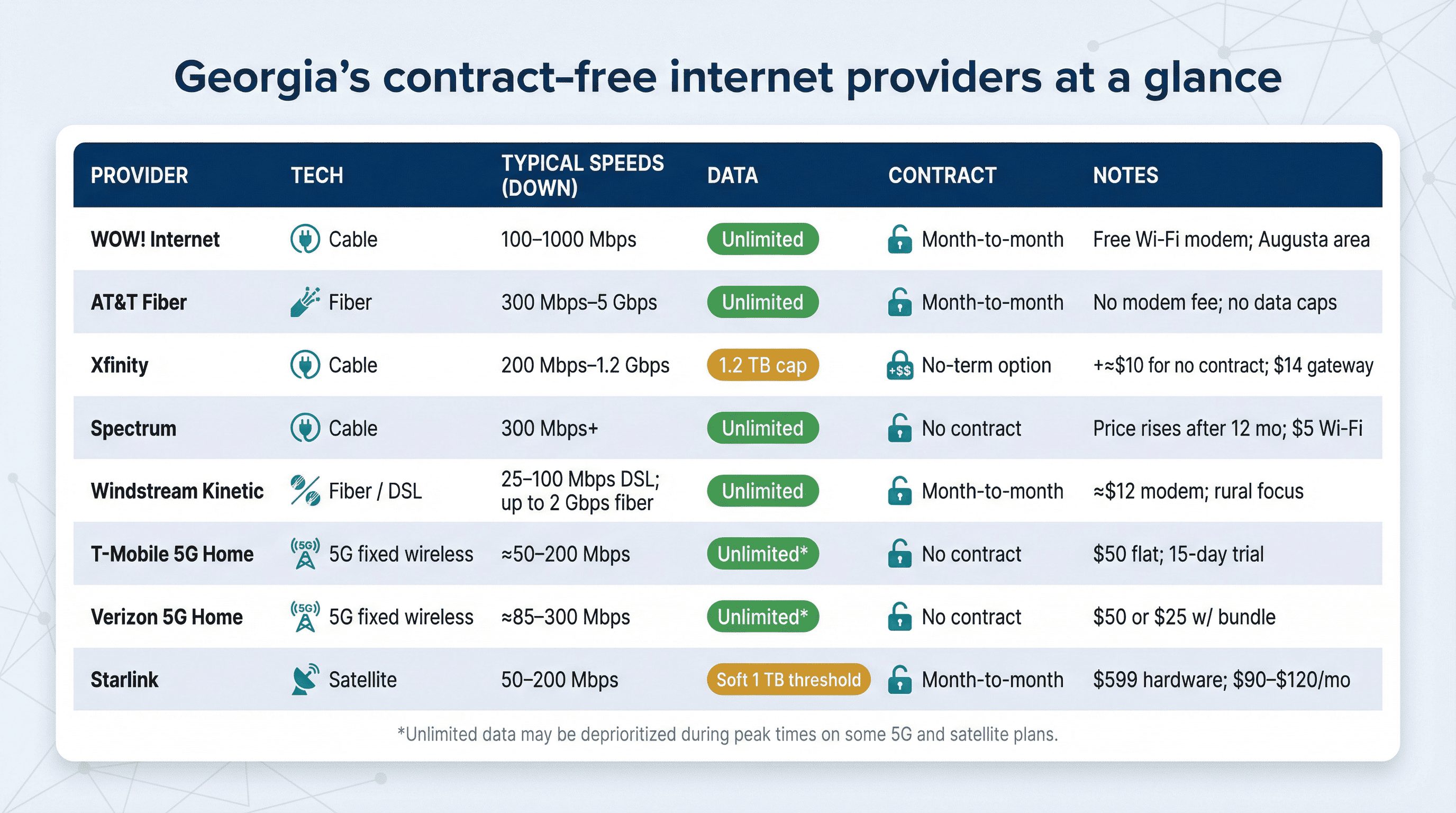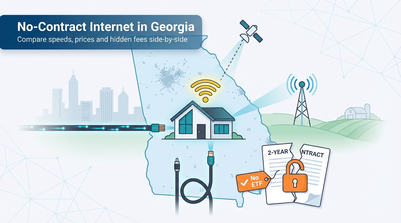 Afraid a no-contract plan costs more? In most cases it doesn’t. Spectrum’s base package now starts at $30 per month in Georgia, taxes extra, with zero commitment, according to Allconnect’s Georgia pricing data. Several fiber providers, including AT&T, advertise the same promo rate whether you sign a contract or not.
