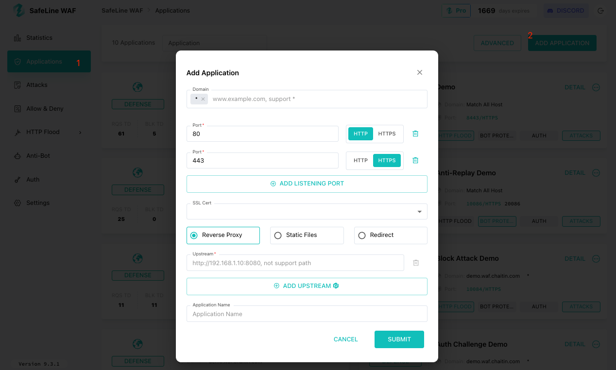 Begin by navigating to the Applications section in the SafeLine dashboard. Click the “Add Application” button, usually located at the top-right corner.