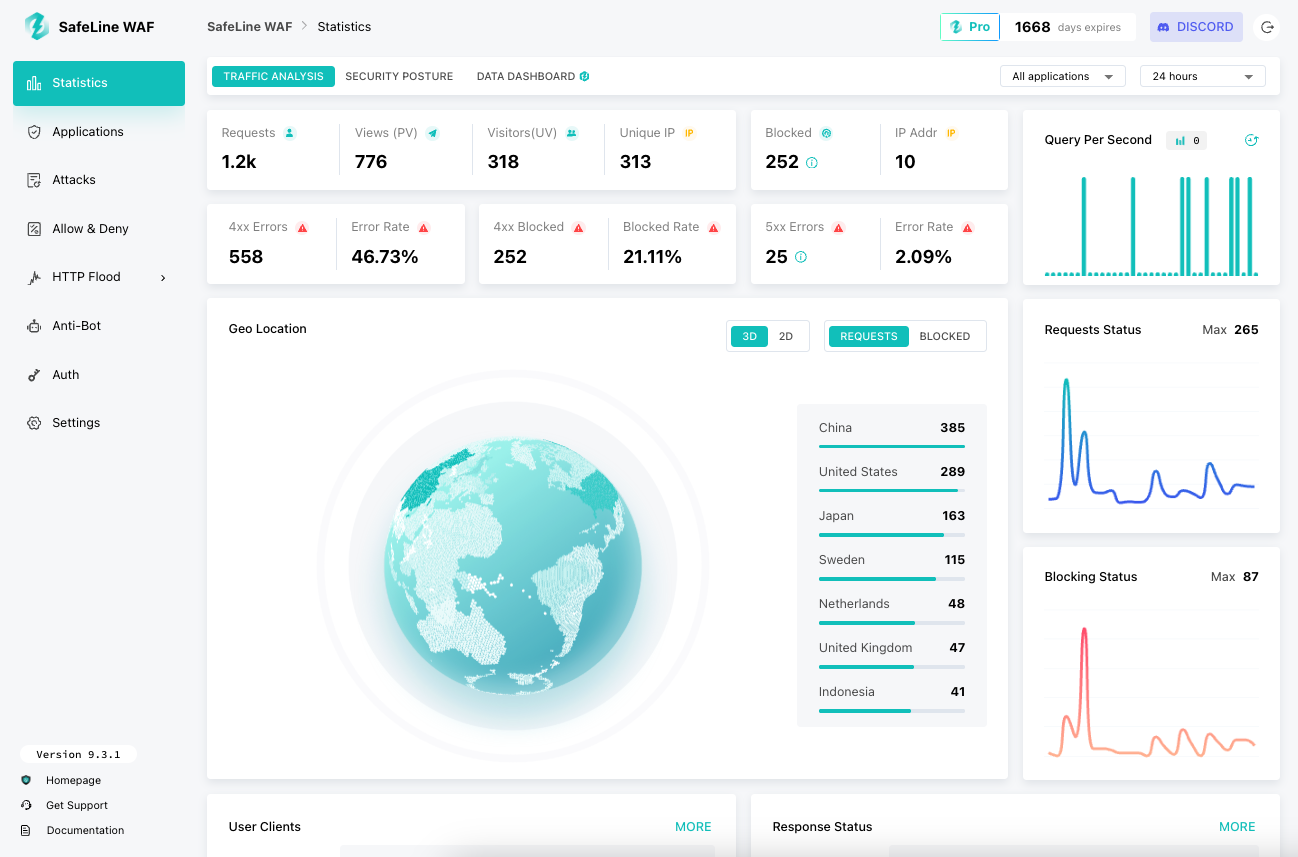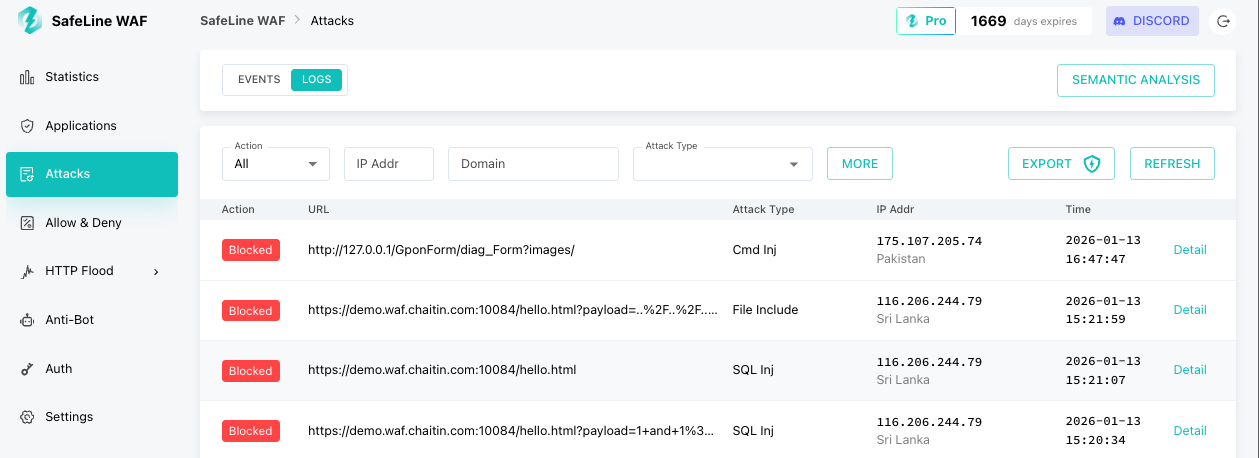 - SafeLine Live Demo (Check before deployment): https://demo.waf.chaitin.com:9443/statistics