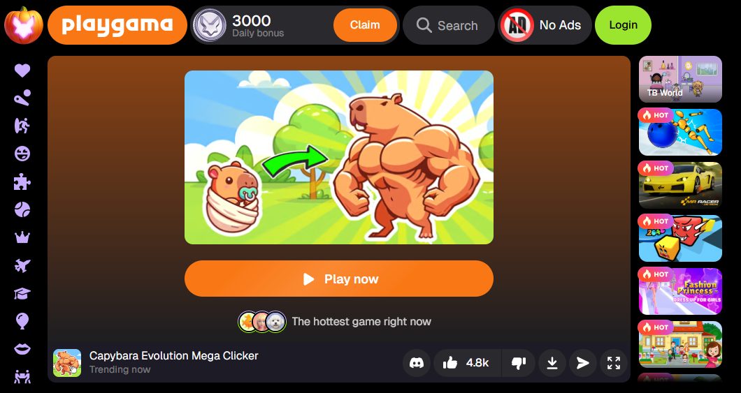 This is the perfect entry point into the world of clicker games. Your goal is to click on the main capybara to generate more capybaras, which serve as your currency. Use them to purchase upgrades that increase your capybaras-per-click and unlock automatic generation.
